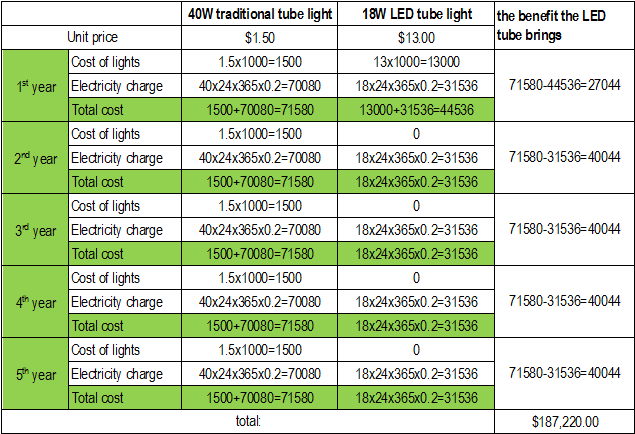 1, suppose 1000 pcs of tube lights are used in the project and they work 24 hours each day simply for easy calculation.